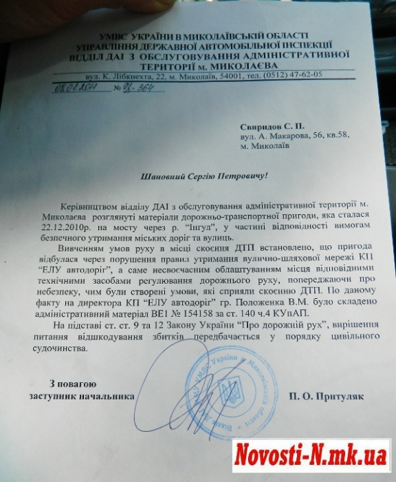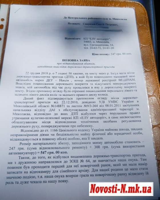 - После этого случая я написал заявление в суд. Но спустя несколько месяцев мне пришел ответ, что заявление не принято из-за того, что было составлено не по форме. Мы обратились к адвокату, который помог правильно оформить все документы, также есть у меня квитанции на оплату как ремонта автомобиля, так и его транспортировки на эвакуаторе на СТО. Что примечательно, мы взяли и заключение в ГАИ, в котором четко значилось, что «ДТП произошло из-за нарушения правил содержания улично-дорожных путей КП «ЭЛУ автодорог». Мы обратились в Центральный районный суд г. Николаева и вот сегодня, 24 июля, должно было состояться первое судебное заседание, - сообщил Сергей Петрович.