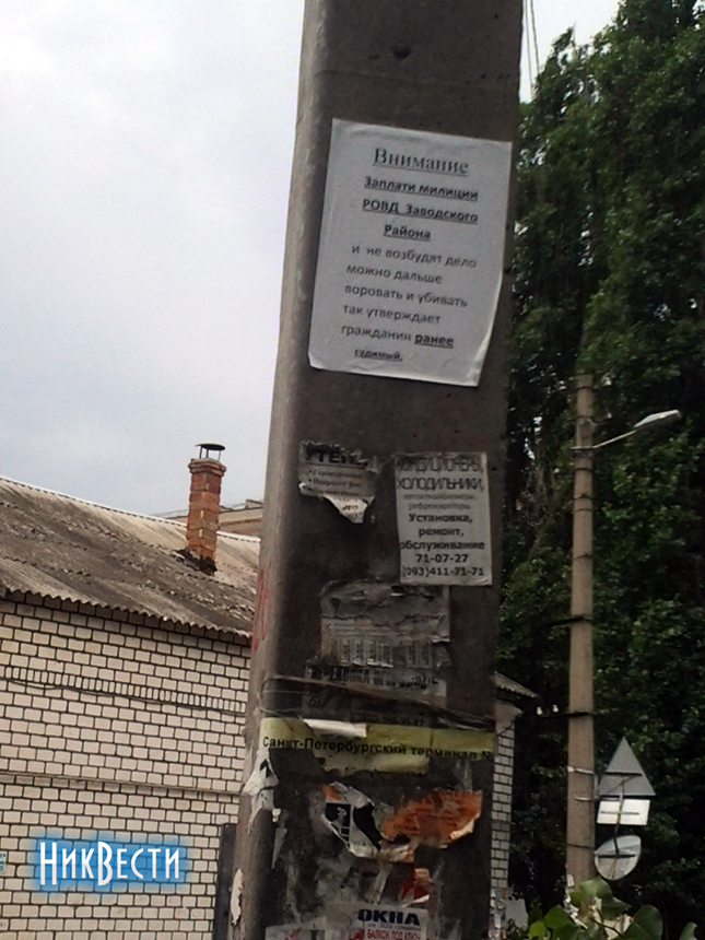 «Внимание. Заплати милиции РОВД Заводского района - не возбудят дело, можно и дальше воровать и убивать. Так утверждает гражданин ранее судимый», - написано на плакатах.