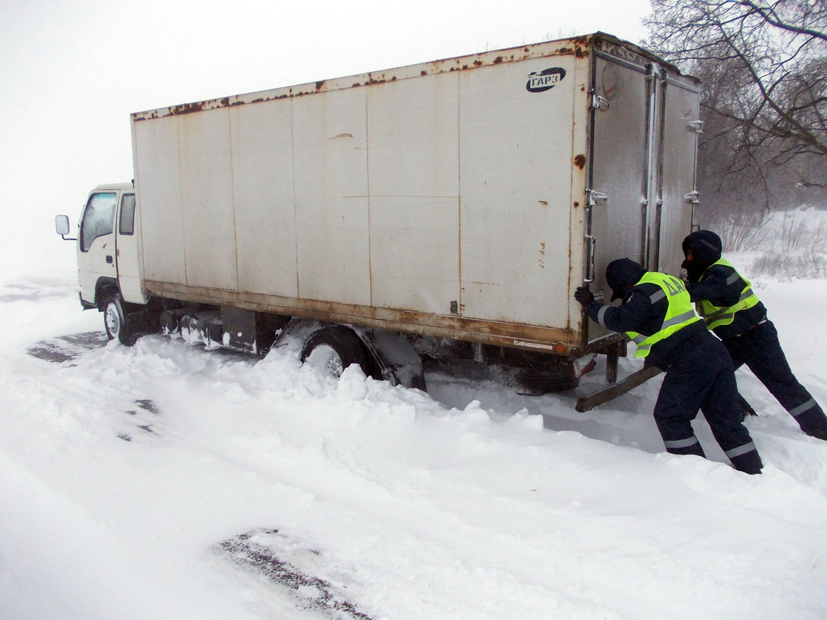 Работники ГАИ осуществляют регулировочно-распорядительные действия и оказывают помощь участникам дорожного движения, которые оказались в затруднительной ситуации из-за непогоды.