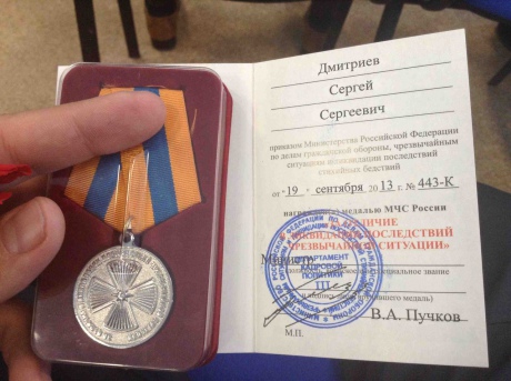 В октябре 2014 года Дмитриев получил от главы МЧС РФ Владимира Пучкова медаль «За отличие в ликвидации последствий ЧС».