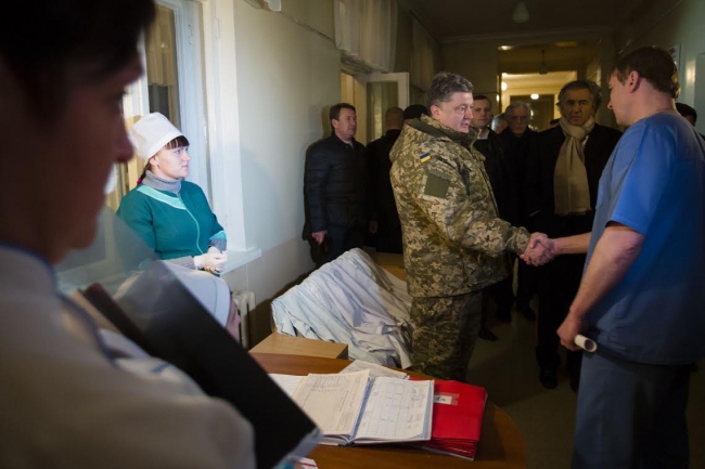 Во время посещения городской больницы, в который находятся пострадавшие, Президент обошел палаты и пообщался с ранеными, поддержал их и поручил главе Донецкой ОГА оказать помощь всем пострадавшим от обстрела, в первую очередь - раненым. «Обеспечьте людей всем необходимым - лекарствами, необходимой медицинской помощью», - сказал он, обращаясь к председателю ОГА Александра Кихтенко.