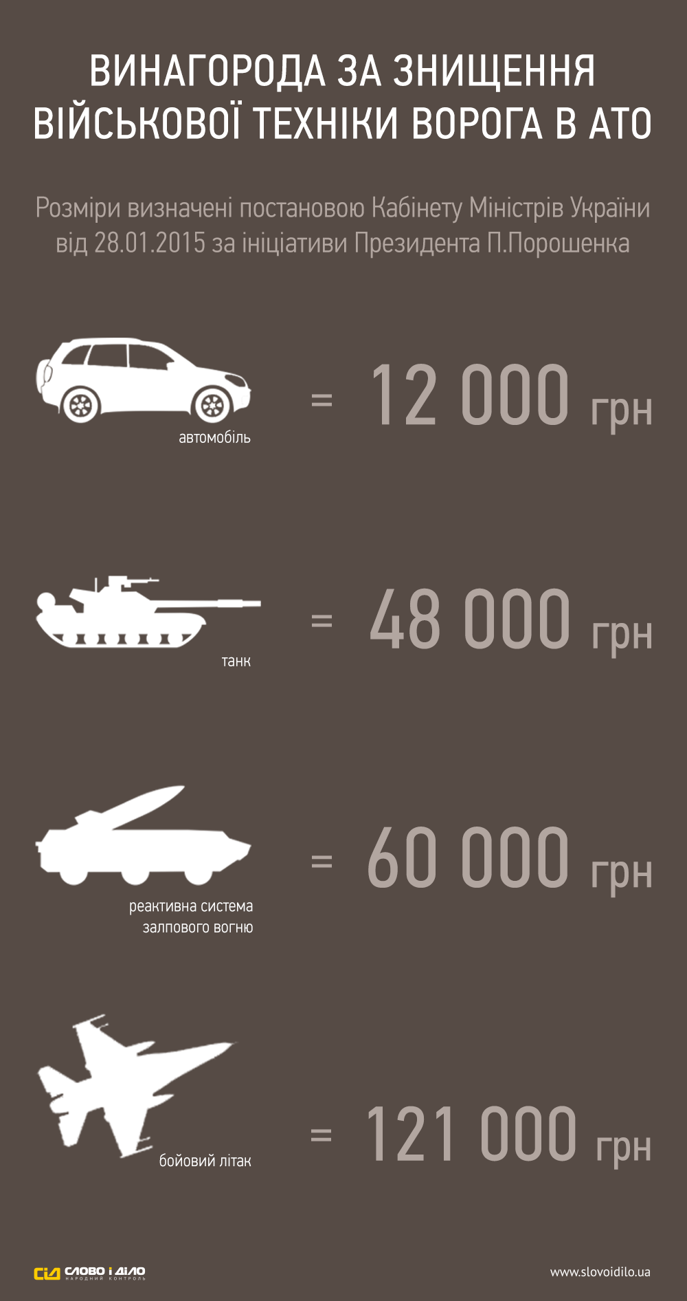 Напомним, в конце января Кабинет министров Украины принял постановление, по которому участники АТО будут получать дополнительное вознаграждение за уничтожение военной техники противника.