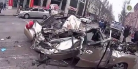 В центре Донецка танк боевиков раздавил легковой автомобиль.