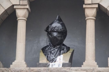 Бюст Ленина в Челябинске был раскрашен неизвестными в цвета украинского флага. Скульптура, находящаяся в центральной части этого российского города, в данный момент уже оцеплена полицейскими и накрыта черным пакетом.