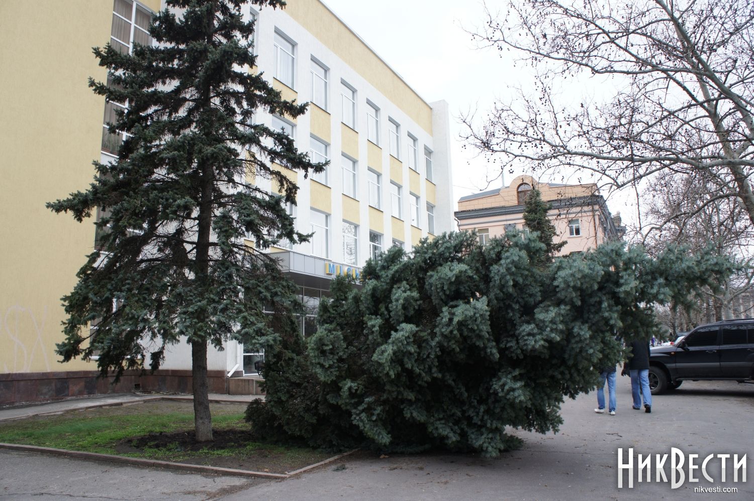 Вчера в Николаеве шквальный ветер повалил 10-метровую ель возле мэрии.