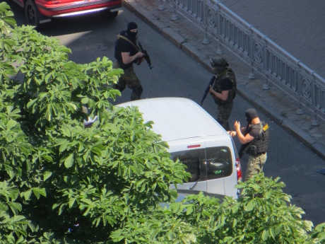 Около 12.35 семь человек в камуфляже и бронежилетах с надписью "Милиция" и с автоматами догнали микроавтобус. Они подбежали к транспортному средству серого цвета и пытались задержать водителя или тех, кто был внутри. Силовики разбили стекло авто и попытались вытянуть водителя. В этот момент машина тронулась, правоохранители произвели несколько выстрелов по колесам.