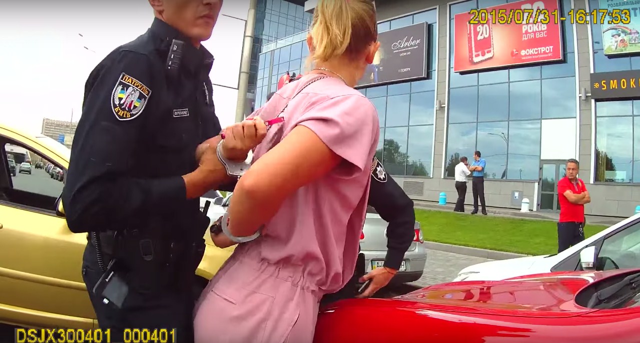 В Сети появилось видео, показывающее работу киевских полицейских. На нам запечатлен момент задержания блондинки в розовом, попытавшейся давить машиной сотрудников правоохранительных органов. После того как Nissan Qashqai девушки был заблокирован, патрульные смогли вытащить ее из джипа и надеть наручники.