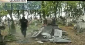 На видео молодой человек в балаклаве долго бьет кувалдой по монументу, который в результате обрушился.