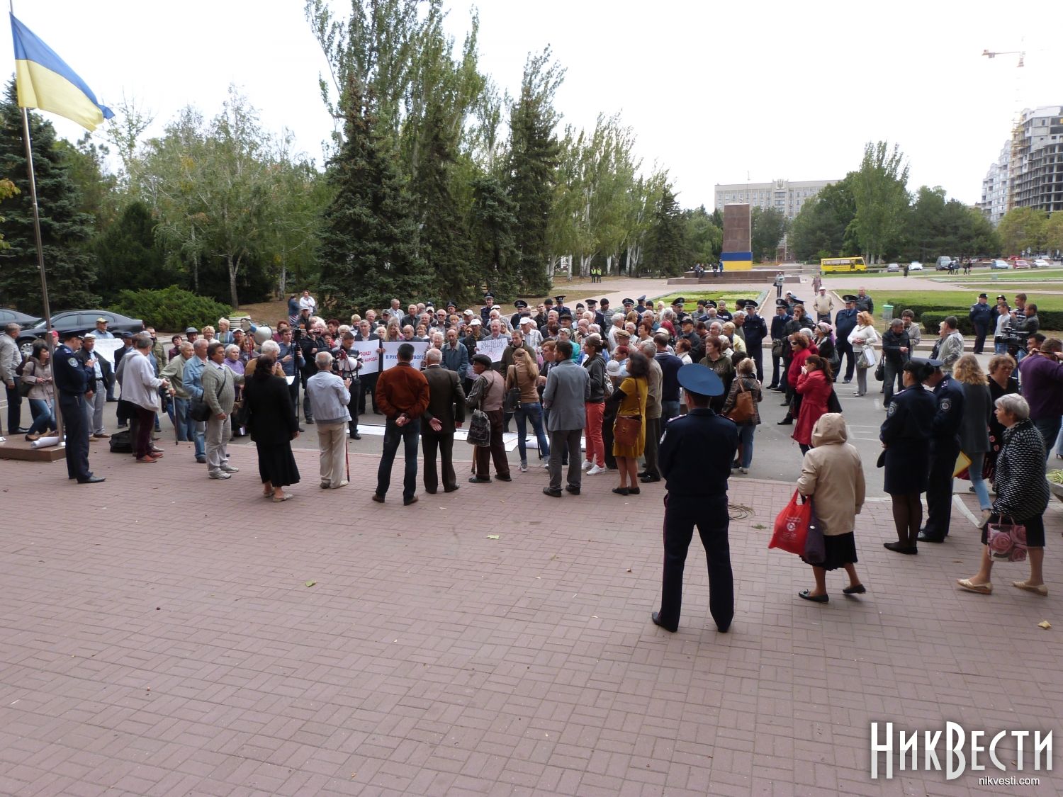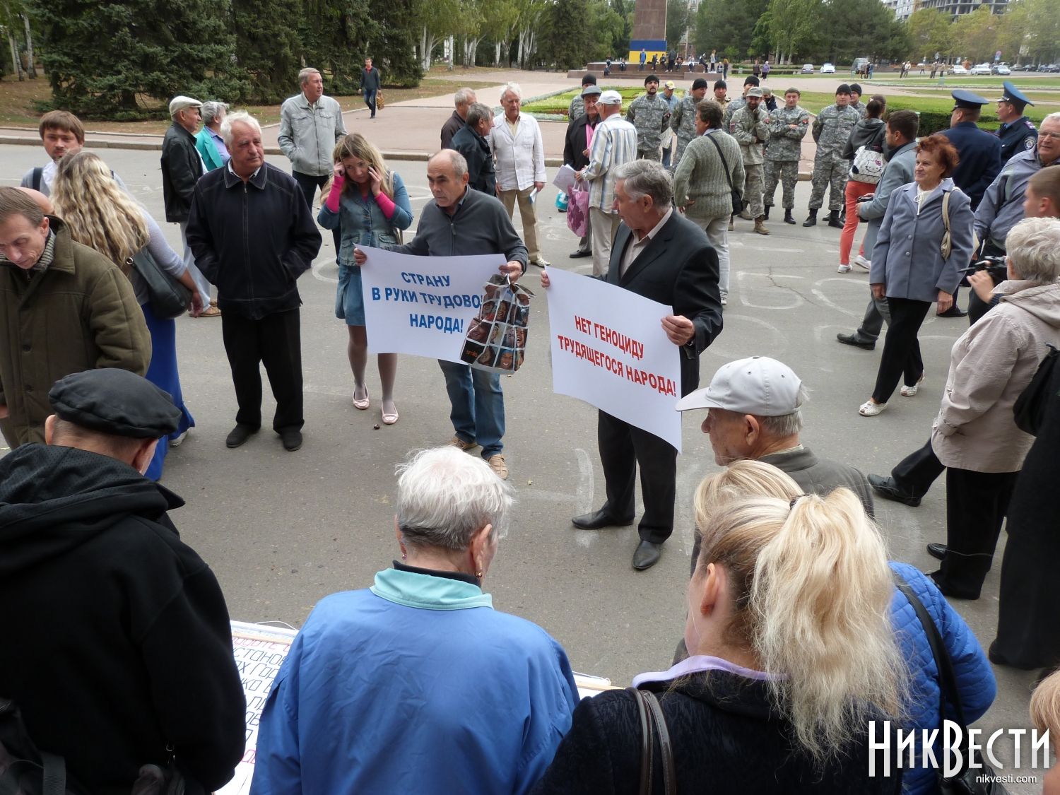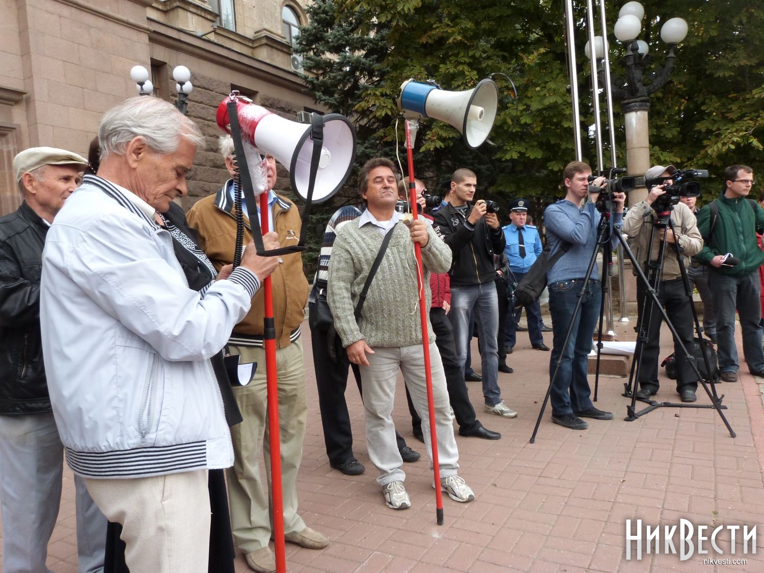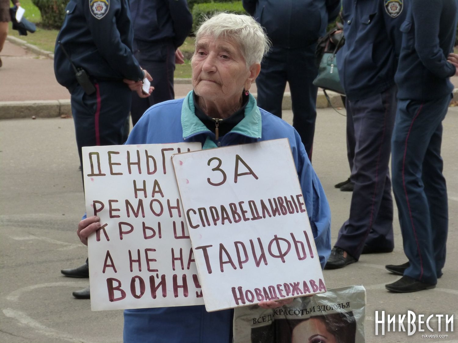 Сегодня, 30 сентября, перед зданием Николаевского городского совета прошла акция протеста против тарифов и «социального геноцида», ее организаторы – ныне действующие депутаты горсовета от КПУ Елена Свинарчук, Николай Персань и Вячеслав Николашин, которые уже успели попасть в избирательные списки от политической партии «Нова держава».