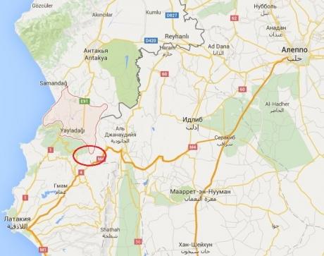 На приведенной карте траектория российского Су-24 обозначена красной линией. Как видно, самолет кружил в воздушном пространстве Сирии в районе турецкой границы и несколько раз пересек воздушное пространство Турции в провинции Хатай.