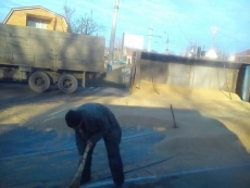 Судя по фотографиям, движение на данном участке затруднено из-за зерна. Водитель грузовика пытается его собрать.