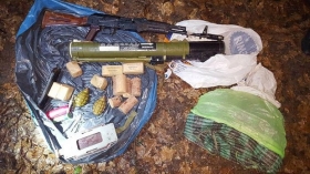 Сотрудники спецслужбы изъяли из схрона гранатомет "РПГ-22", автомат Калашникова с патронами, магнитную мину СПМ, гранаты Ф-1 и более 1 кг тротила.
