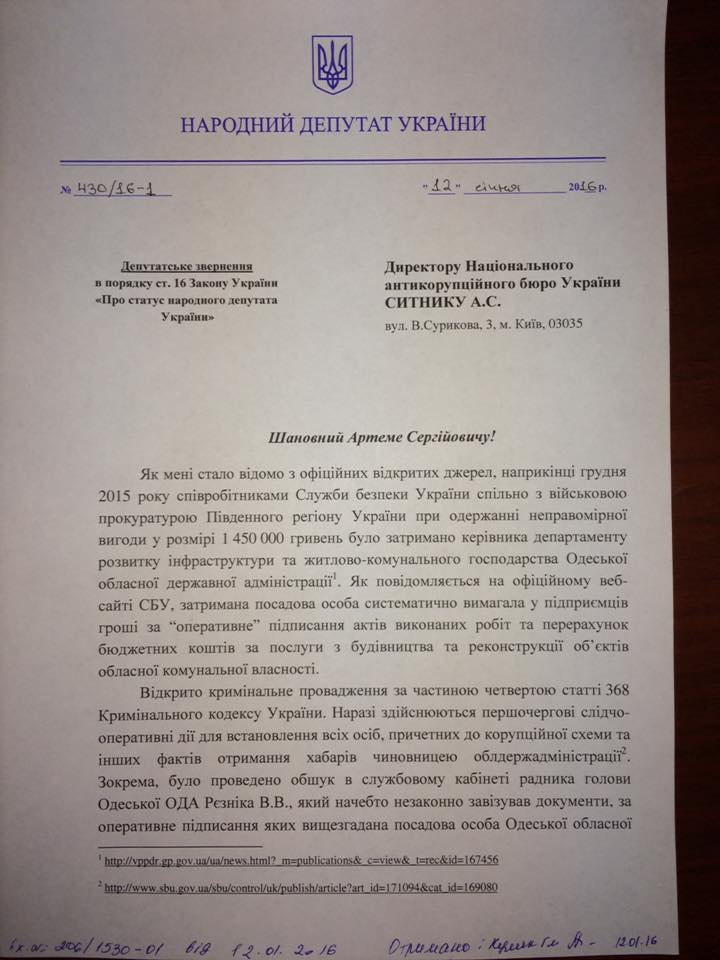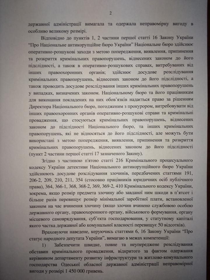 Об этом говорится в соответствующем депутатском обращении к главе НАБУ, которое депутат обнародовал на странице в Facebook.