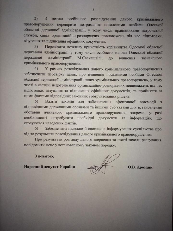 Парламентарий также просит проверить возможную причастность руководства Одесской ОГА, в том числе Михаила Саакашвили, к совершенному правонарушению.