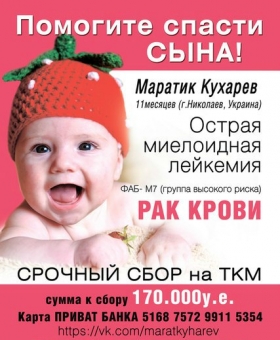 Родные годовалого Марата Кухарева обращаются за помощью ко всем неравнодушным. У мальчика диагноз острый миелоидный лейкоз или рак крови. 4 месяца ребенка лечили в киевском Охматдете. Сейчас он проходит четверную химиотерапию в Беларуси. Марату требуется срочная пересадка костного мозга.