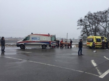 В результате столкновения маршрутка и легковой автомобиль слетели с дороги. Участок дороги, где случилась авария, перекрыли и организовали одностороннее движение.