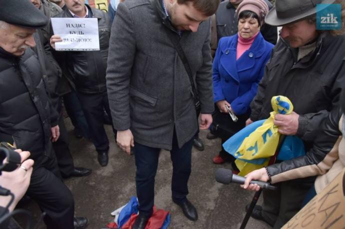Народный депутат Владимир Парасюк, который принимал участие в митинге, сорвал флаг Российской Федерации.