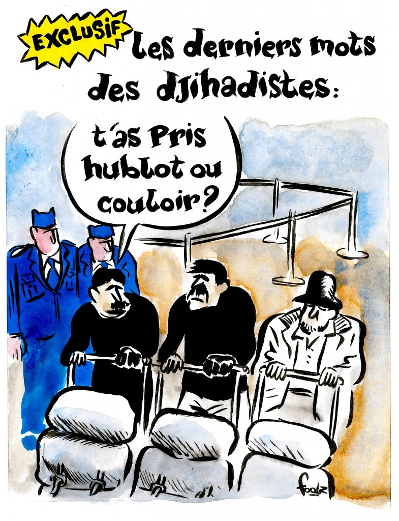 Картинку сопровождает подпись "Последние слова джихадистов", и один из террористов обращается к другому: "Ты взял у окна или у прохода?".