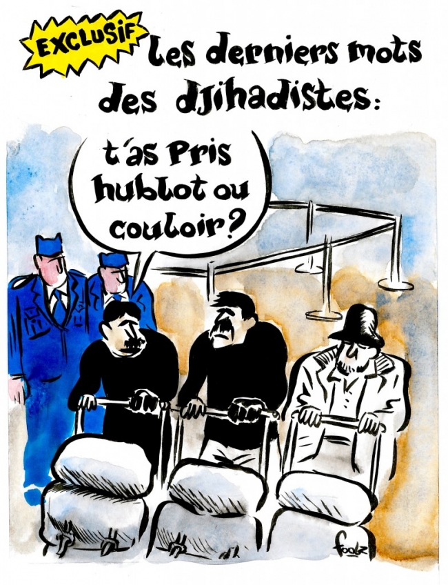 Первая карикатура является отсылкой к кадру с видеозаписи, на которой были запечатлены подозреваемые в совершении терактов в Брюсселе - братья Ибрагим и Халед Бакрауи и Наджим Лаашрауи.