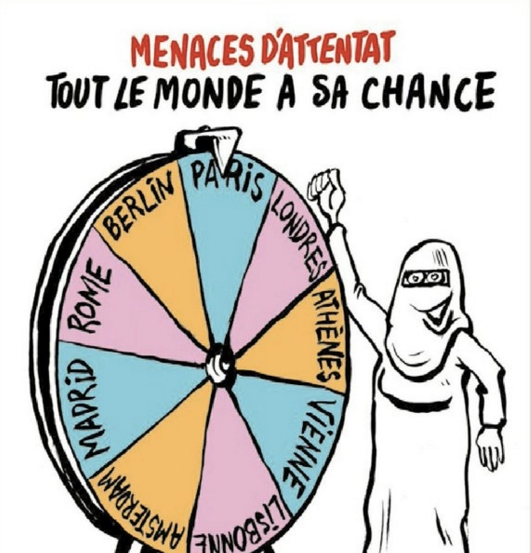 Отметим, что 21 марта, в понедельник, за день до теракта в номере Charlie Hebdo вышла карикатура, на которой изображено колесо фортуны, на котором написаны названия европейских столиц (Брюсселя среди них нет, - ред.). Карикатуру сопровождала подпись: "Угроза теракта: шанс есть у всего мира".
