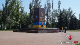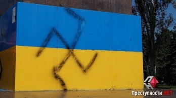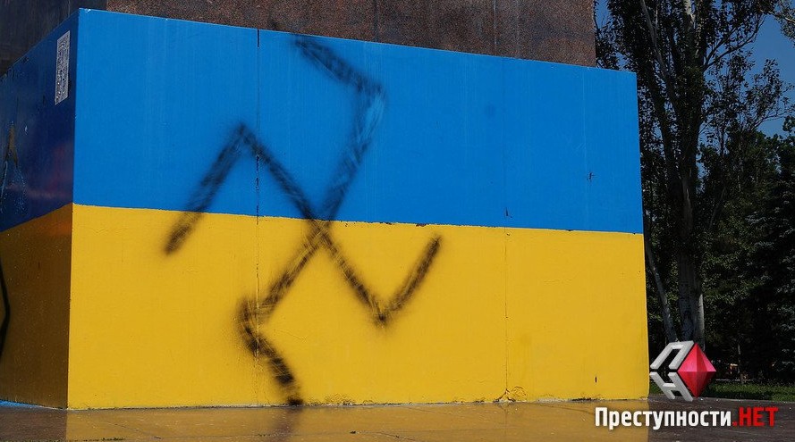 Так, в ночь с четвертого на пятое июня, на постаменте, который покрашен в цвета украинского флага, появилась свастика.