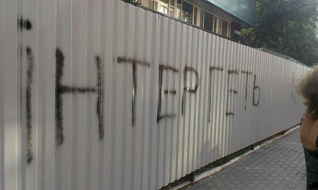 После того как неизвестные подожгли здание телеканала «Интер» на улице Щусева в Киеве, центральный офис на Дмитриевской обнесли двухметровым забором.