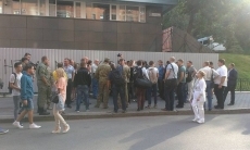 Утром возле здания телеканала начали собираться активисты. Несколько человек обрисовали забор краской. Полицейские просят собравшихся не нарушать правопорядок.