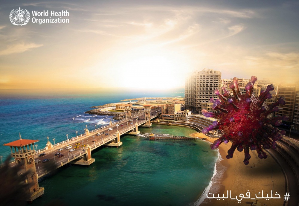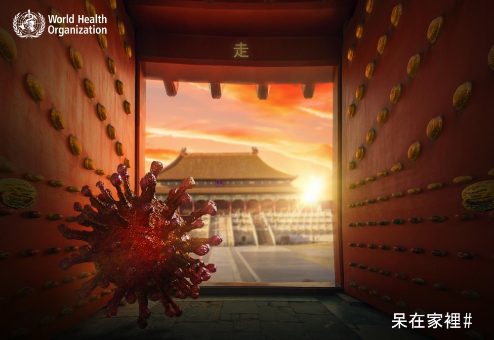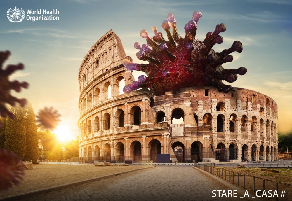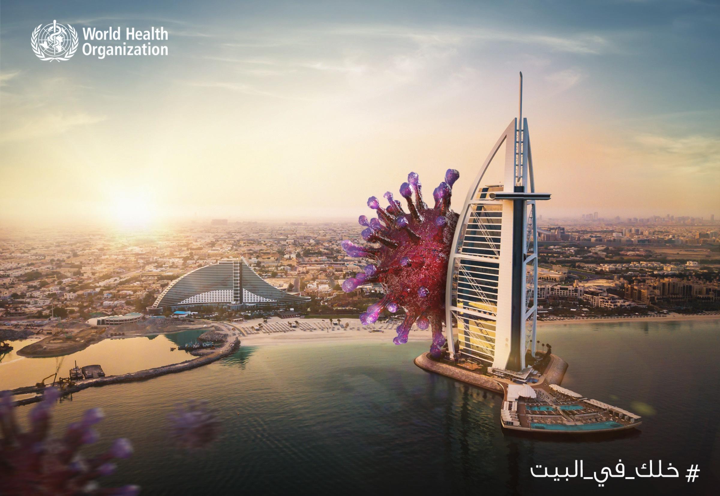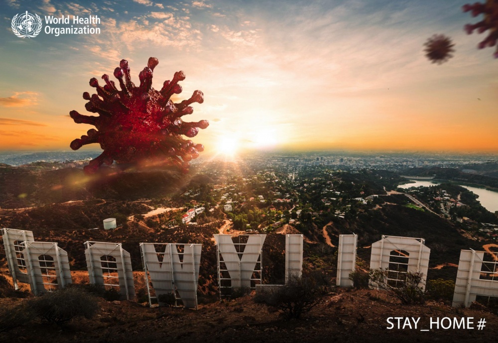 На постерах можно увидеть, как огромный коронавирус разгуливает по планете: мимо известного отеля Бурдж-эль-Араб в ОАЕ, китайской святыни, Колизея в Риме, по склонам в Голливуде.