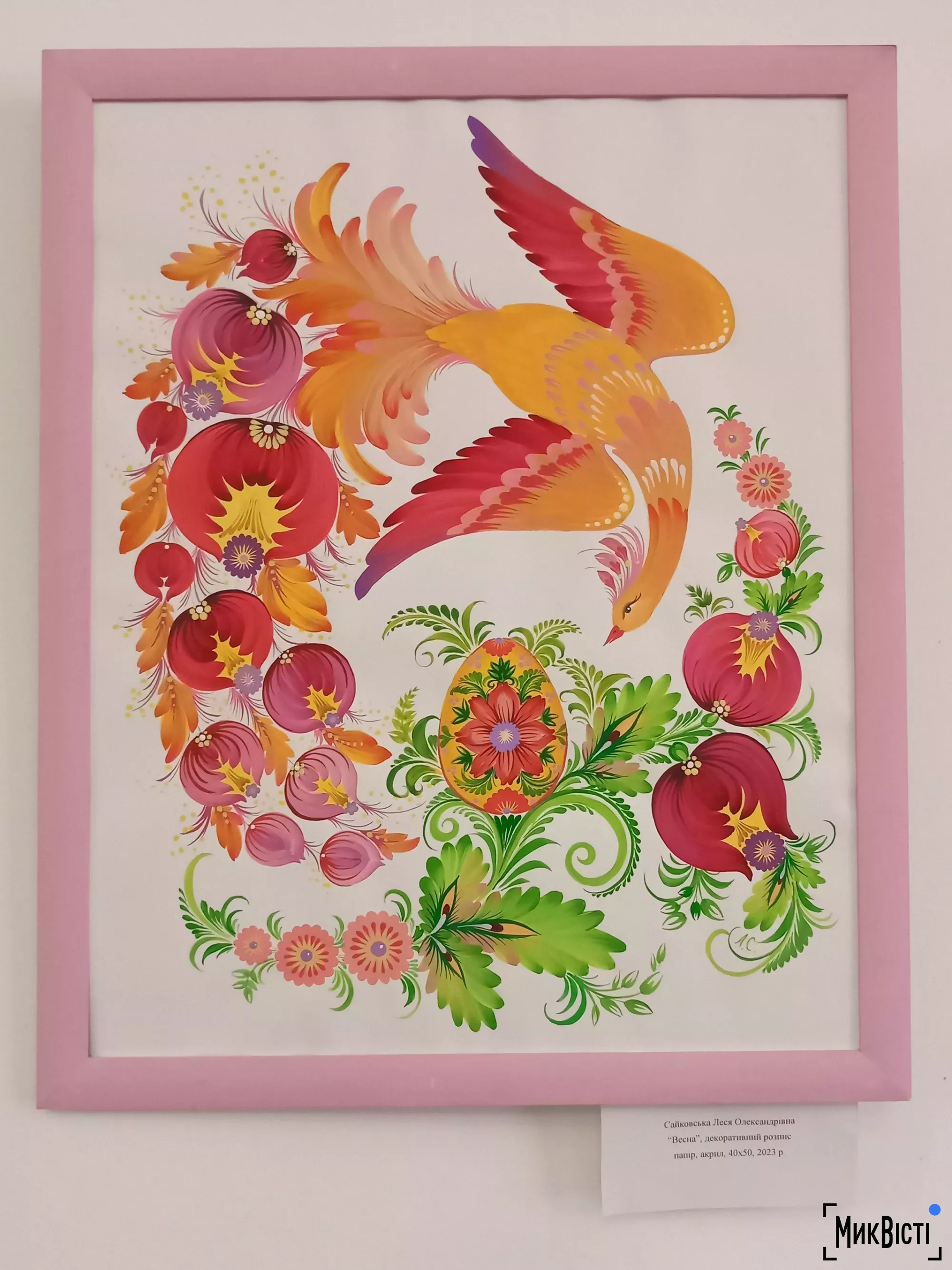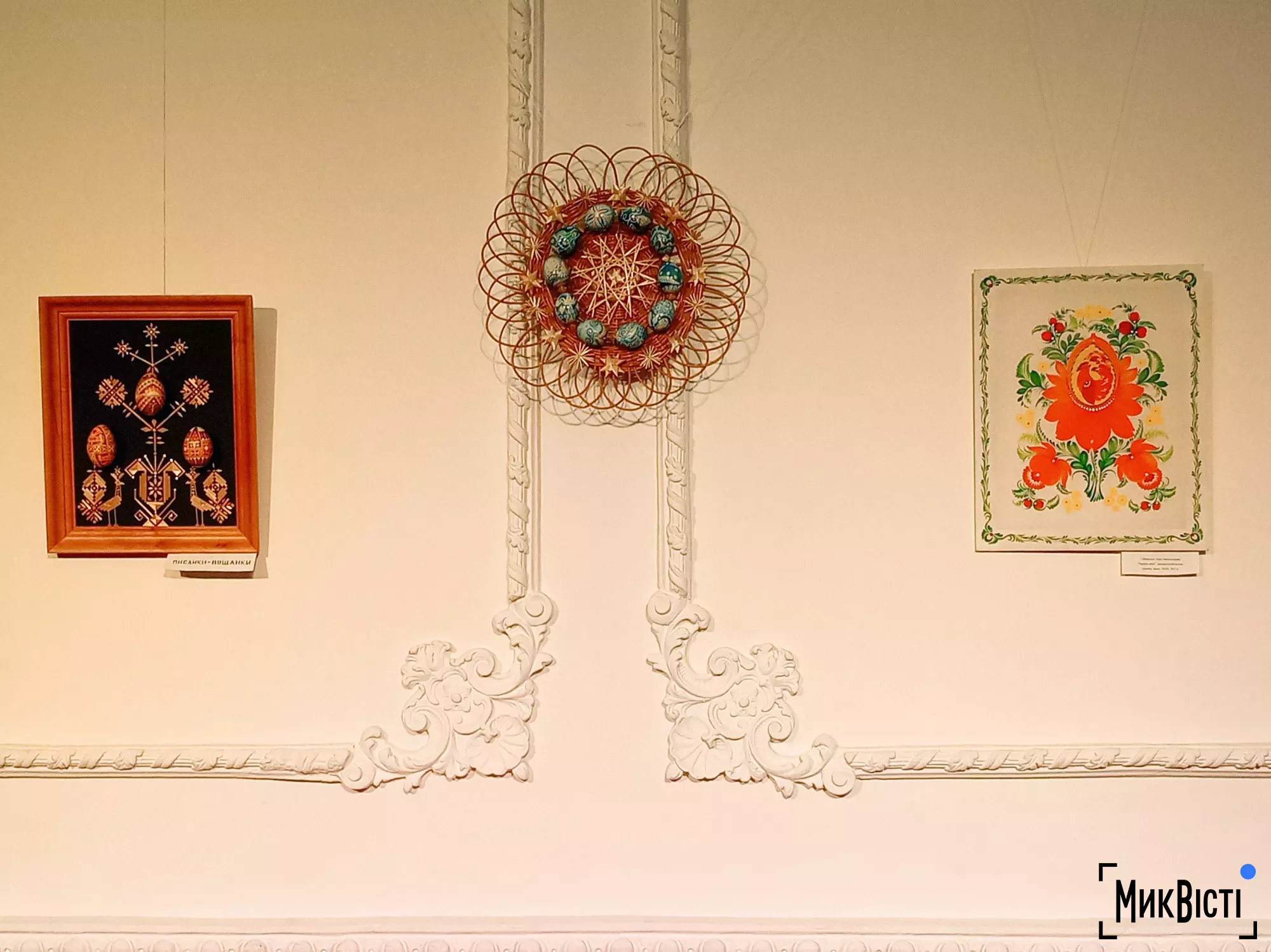 Среди представленных работ – писанковые композиции заслуженной мастерицы народного творчества Украины Татьяны Ульянкиной, расписные панно в технике таврической и петриковской росписи Леси Сайковской и Елены Коркишко, а также украинские берегини, созданные Светланой Бойковой-Калюжной.