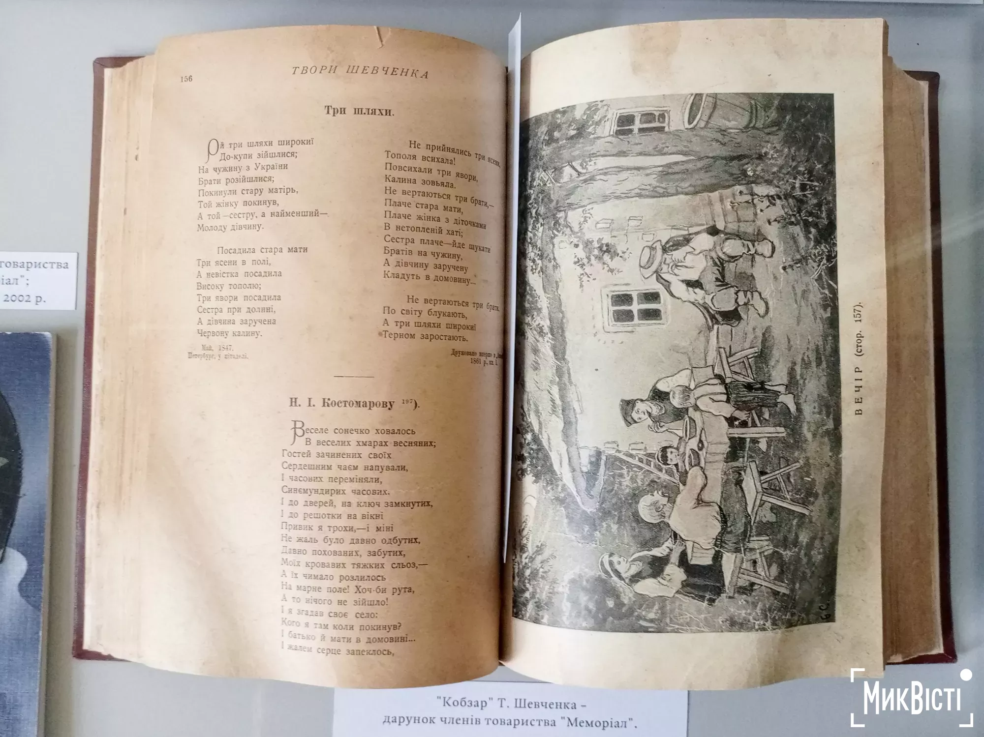 В экспозиции выставки представлены материалы Игоря Марцинкивского — коллекционера, председателя «Просвиты» с 2010 года. Также экспонируется уникальное издание «Кобзаря» Т. Шевченко, принадлежащее Юрию Зайцеву — лауреату Аркасовской премии за исследования малоизвестных страниц украинской истории.
