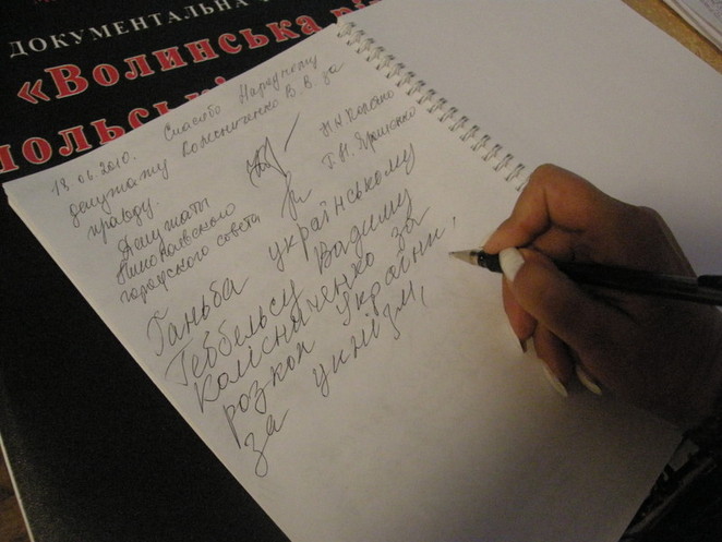 В предпоследний день экспонирования в Николаеве выставки «Волынская резня: польские и еврейские жертвы ОУН-УПА», которую представлял депутат Верховной Рады Украины Вадим Колесниченко, у входа в Николаевский русский драмтеатр собрались пенсионеры, простые жители города. Организатор того собрания, заместитель главы Николаевской партии ВО «Свобода» Наталья Грудинина, позвала всех желающих высказать свое мнение о выставке проходившей в театре.