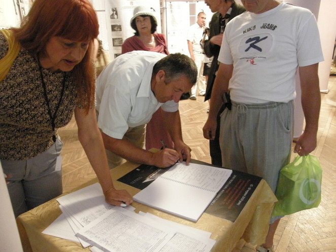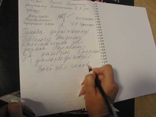 После недолгой беседы пенсионеры все-таки решили пройти в театр, чтобы посмотреть выставку. Там они по очереди оставляли свои записи в книге отзывов, требуя прекратить проведение выставки.