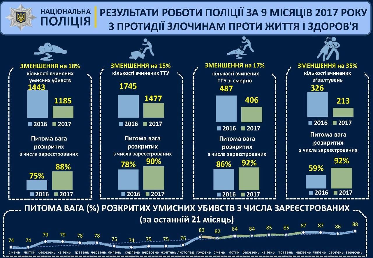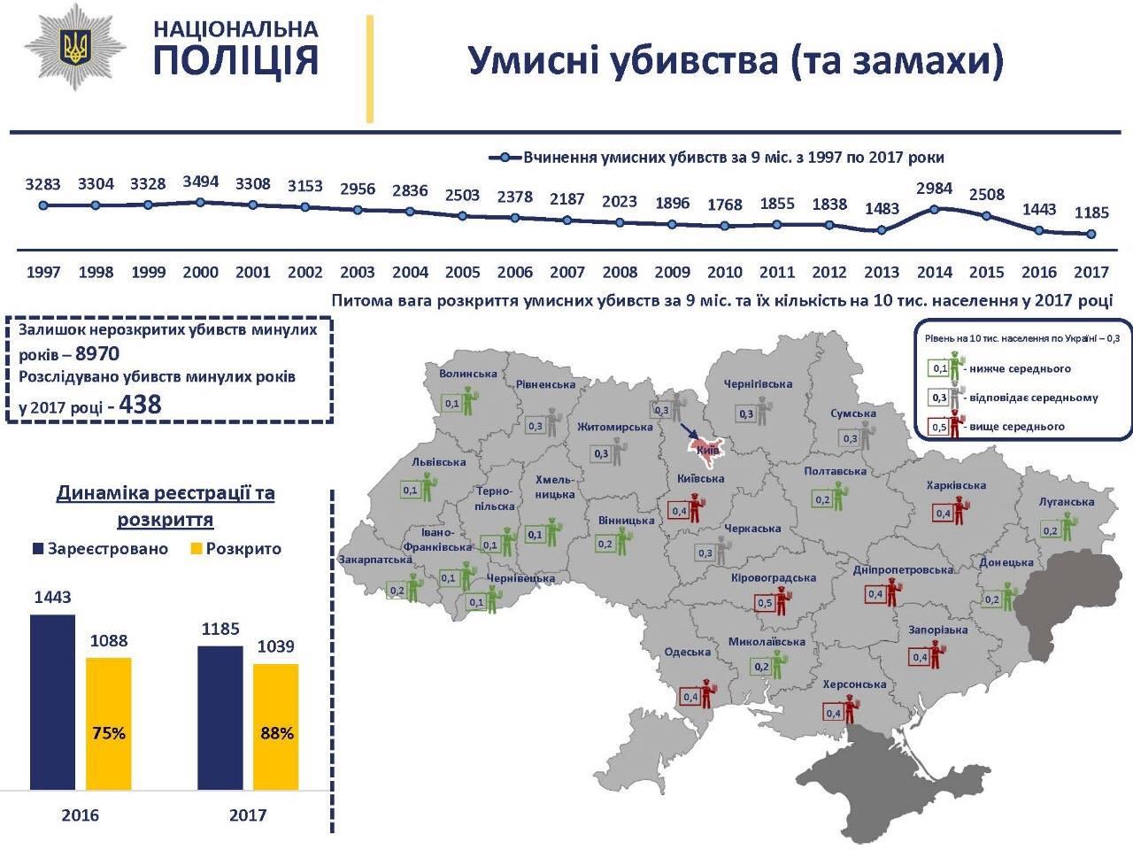 С начала года в Украине произошло 1185 умышленных убийств и покушений. Это самый низкий показатель за последние 10 лет. Уровень раскрытия таких преступлений, с учетом прошлых лет, в этом году по стране составляет 88%.