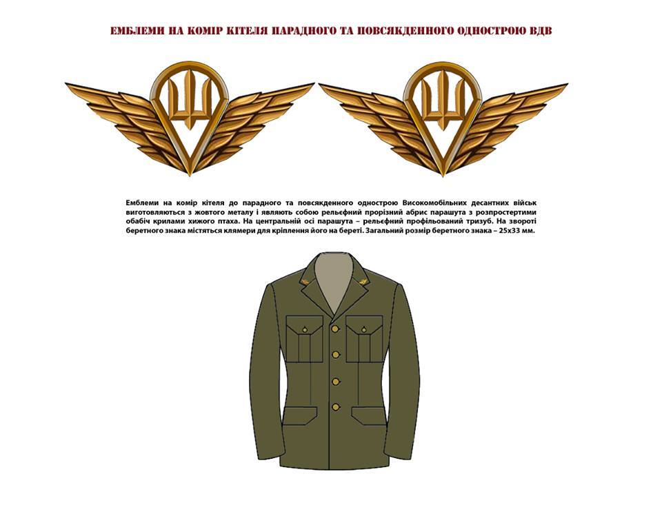 В командовании ВДВ Украины отметили, что изменения коснутся и беретных знаков десантников. Сообщается, что на них будет изображен купол парашюта как символ десантных подразделений во всем мире, крылья Архистратига Михаила и огненный меч, которым он выжигает священным огнем скверну.