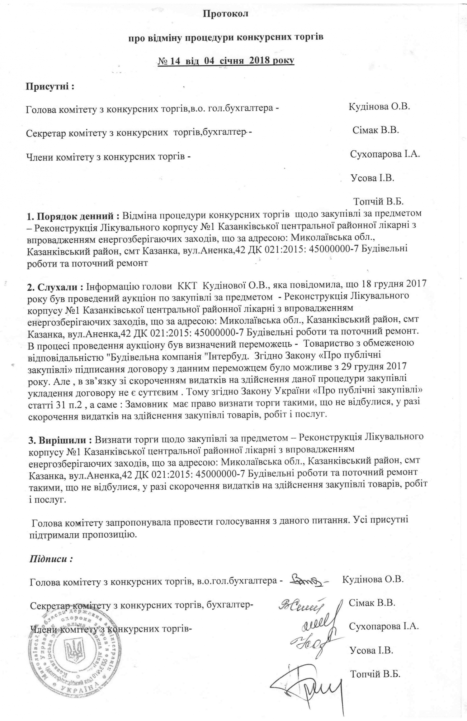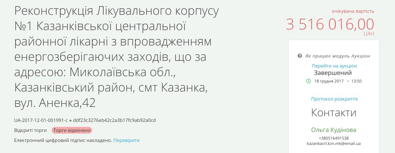 Коммунальное предприятие «Казанковская центральная районная больница» провела торги на реконструкцию лечебного корпуса №1 с внедрением энергосберегающих мер, но в последний момент, уже перед подписанием договора с подрядчиком, объявила торги отмененными.