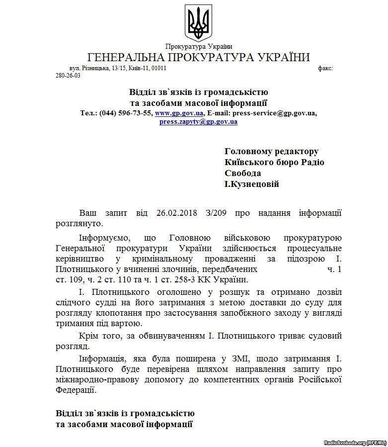 Генеральная прокуратура Украины намерена направить запрос в Россию с целью проверить достоверность обнародованной в СМИ информации о задержании экс-главаря «ЛНР» Игоря Плотницкого.