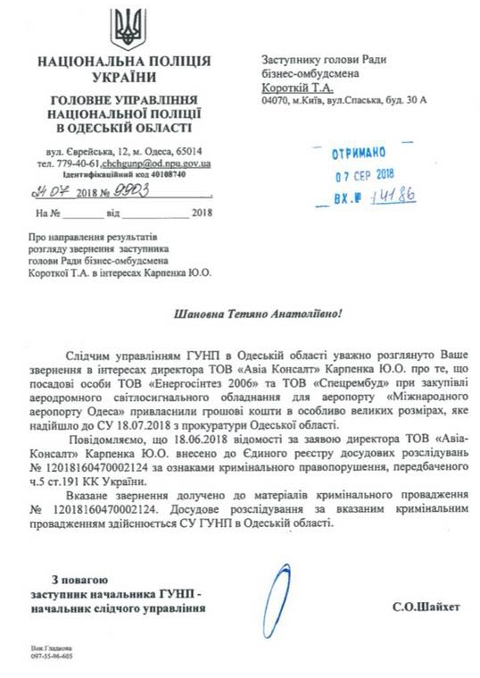 На своей странице в социальной сети «Facebook» юрист Независимого медиа-профсоюза Татьяна Локацкая опубликовала копию ответа заместителя начальника Главного управления Национальной полиции в Одесской области, в котором он сообщает о том, что по состоянию на август 2018 года следственное управлении полиции Одесской области проводит расследование в отношении ООО «Энергосинтез-2006» и ООО «Спецремстрой», которые подозревают в присвоении денег в особо крупных размерах при закупке аэродромного светосигнального оборудования для Международного аэропорта «Одесса».