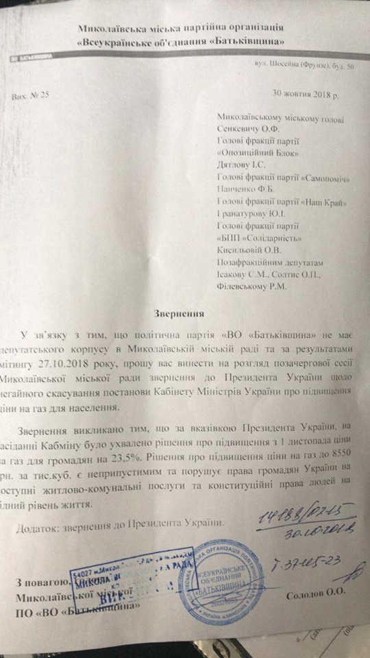«Батькивщинивци» выразили в обращении и позицию горожан, вышедших 27 октября на митинг против управляющей компании «Місто для людей — Миколаїв» и против повышения тарифов на газ.
