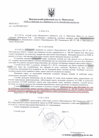 Судья Центрального районного суда Николаева Иван Дирко удовлетворил жалобу и обязал следователя очаковского отдела полиции Кукина В.В. внести в Единый реестр досудебных расследований заявление о незаконном завладении Андреем Протченко видеокамерой.