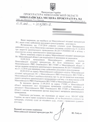 В письме прокурора от 21 сентября 2018 года сказано, что в Николаевская местная прокуратура №1 не смогла получить запрашиваемые материалы уголовного производства, расследуемого очаковской полицией, поскольку они там отсутствуют.