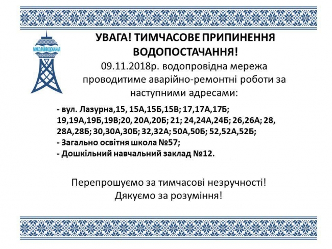 Сообщается, что 9 ноября 2018 года водопроводная сеть будет проводить аварийно-ремонтные работы по следующим номерам: улица Лазурная 15, 15А, 15Б, 15В, 17, 17А, 17Б, 19, 19А,19Б,19В, 20, 20А,20Б, 21, 24, 24А, 24Б, 26, 26А, 28, 28А, 28Б, 30, 30А, 30Б, 32, 32А, 50А, 52, 52А, 52Б.