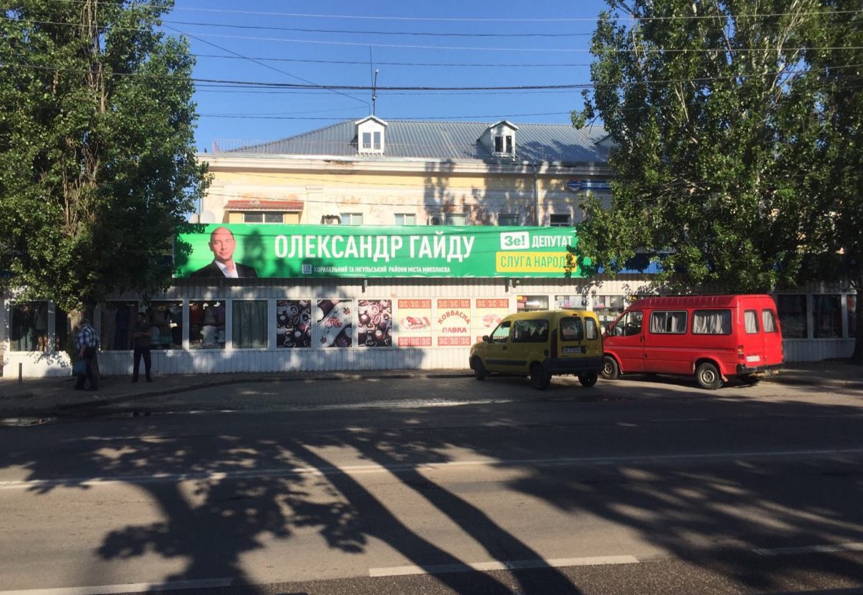 Кроме того, журналист Олег Деренюга у себя в Telegram-канале опубликовал фотографию агитации Александра Гайду, незаконно размещенной на торговых киосках по проспекту Богоявленскому в Корабельном районе Николаева.