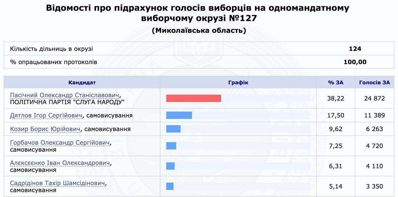 Кандидат от партии «Слуга народа» Александр Пасечный одержал победу, получив 38,22% или 24 872 голосов избирателей.