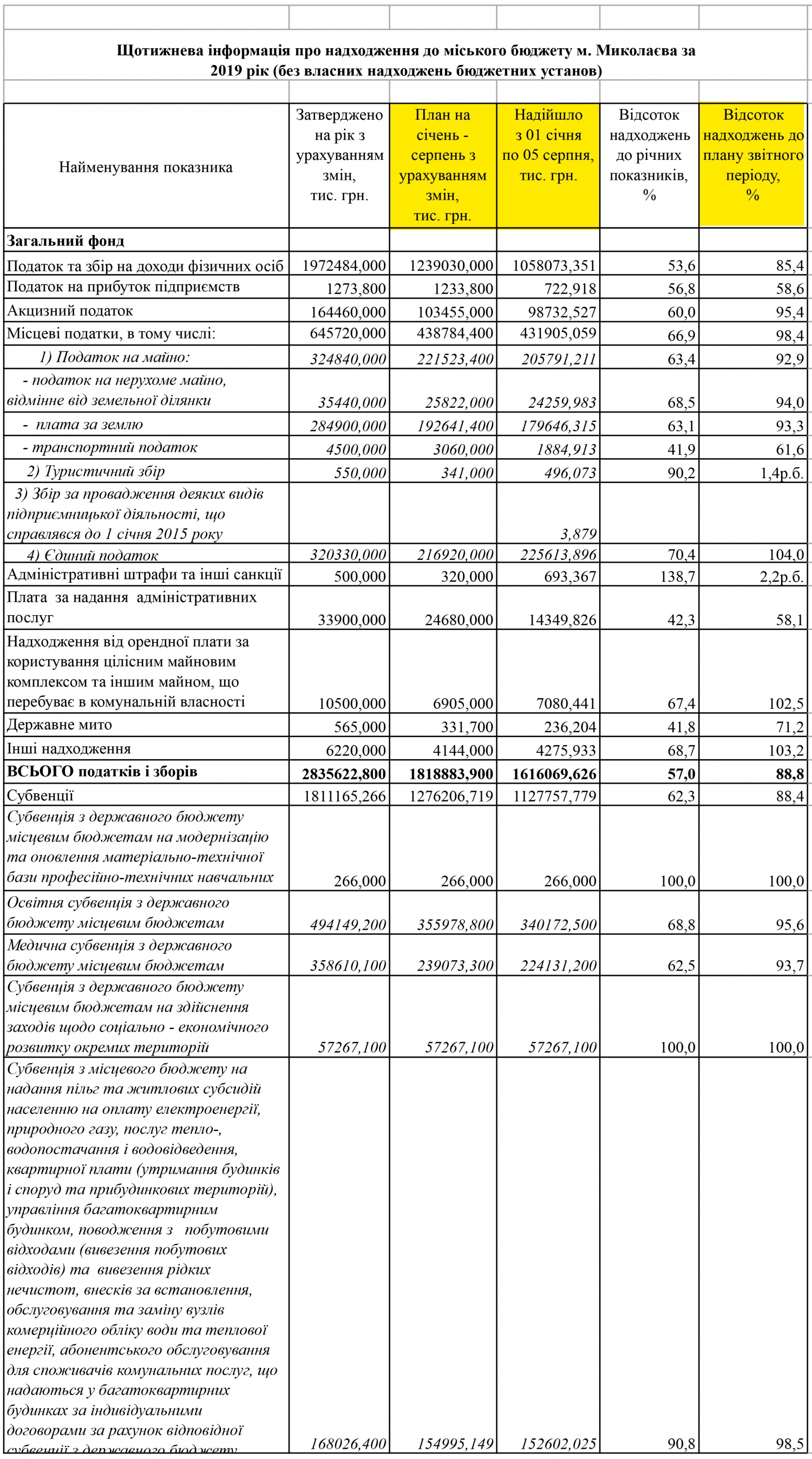 Примечательно, что согласно отчету, доход специального фонда бюджета Николаева за период с 1 января по 5 августа составляет только 59,7% от запланированных на этот период.