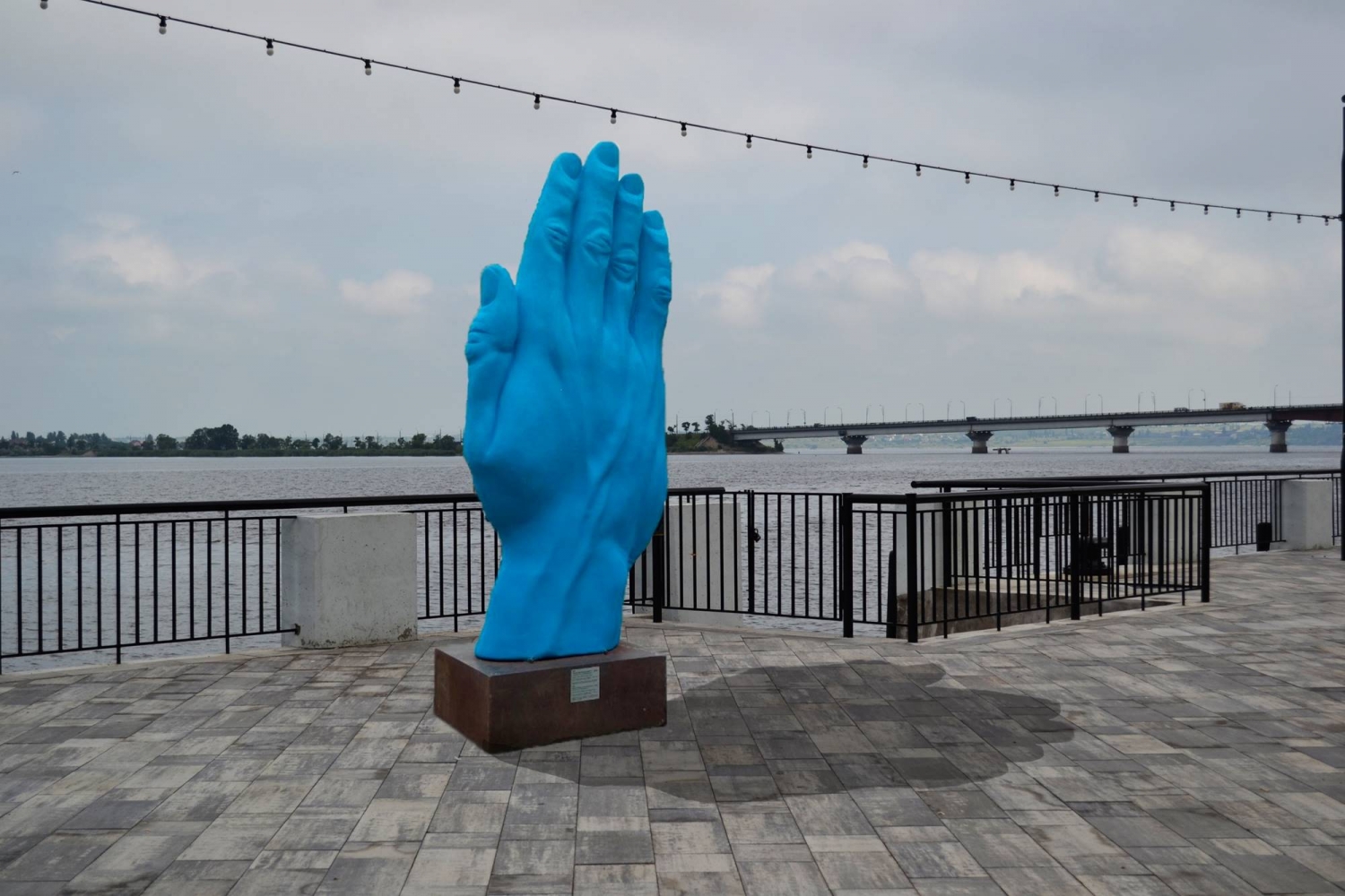 Арт-объект «Middle Way» в виде гигантской синей руки, который ранее стоял в Киеве на Бессарабской площади, установят на набережной арт-пространства *8 ПРИЧАЛ.