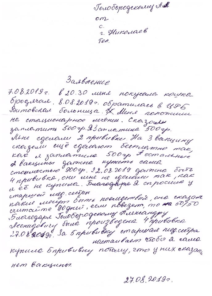 Директор коммунального предприятия «Центр защиты животных» Александр Голобродский заявил, что в Витовской ЦРБ у пациентки требовали деньги за помощь после укуса кошки, настаивая на покупке вакцины за свой счет.