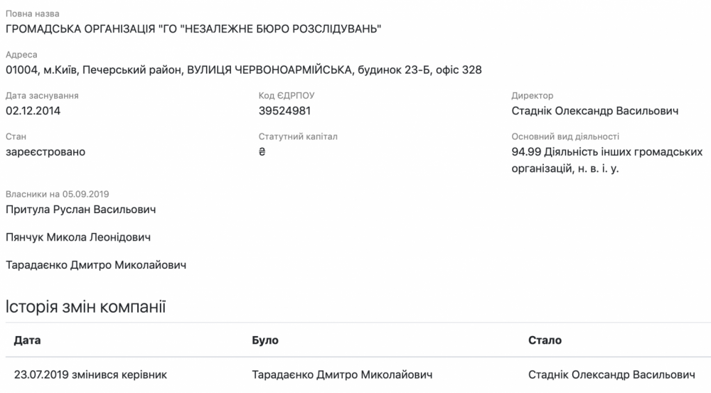 Отметим, что в поданой Александром Стадником декларации от 5 сентября отмечается, что ему принадлежит торговая марка или коммерческое наименование «Независимое бюро расследований», где он является главой.