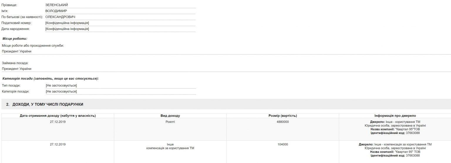 Изменения президент внес в пятницу, 3 января. В частности, Зеленский указал, что 27 декабря 2019 года получил от «Квартала 95» 4 миллиона 880 тысяч гривен роялти и 104 тысяч гривен компенсации за пользование торговой маркой.