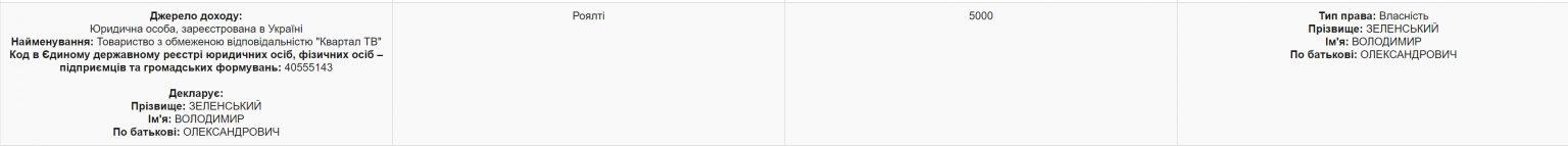 Стоит отметить, что согласно предыдущим декларациям Зеленского, за 2017 год он получил 5 тысяч гривен роялти от «Квартала ТВ».