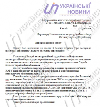 Ранее в суд поступила жалоба от гражданина, который сообщил, что в действиях Баканова и и.о. начальника Главного следственного управления СБУ содержится состав уголовного преступления, предусмотренного частью 2 статьи 364 (злоупотребление властью или служебным положением), частью 2 статьи 368 (получение неправомерной выгоды), частью 3 статьи 365 (превышение служебных полномочий), частью 2 статьи 256 (содействие ОПГ), частью 1 статьи 396 (сокрытие преступления), частью 3 статьи 382 (невыполнение решения суда), частью 1 статьи 111 (государственная измена) и другие противоправные факты.